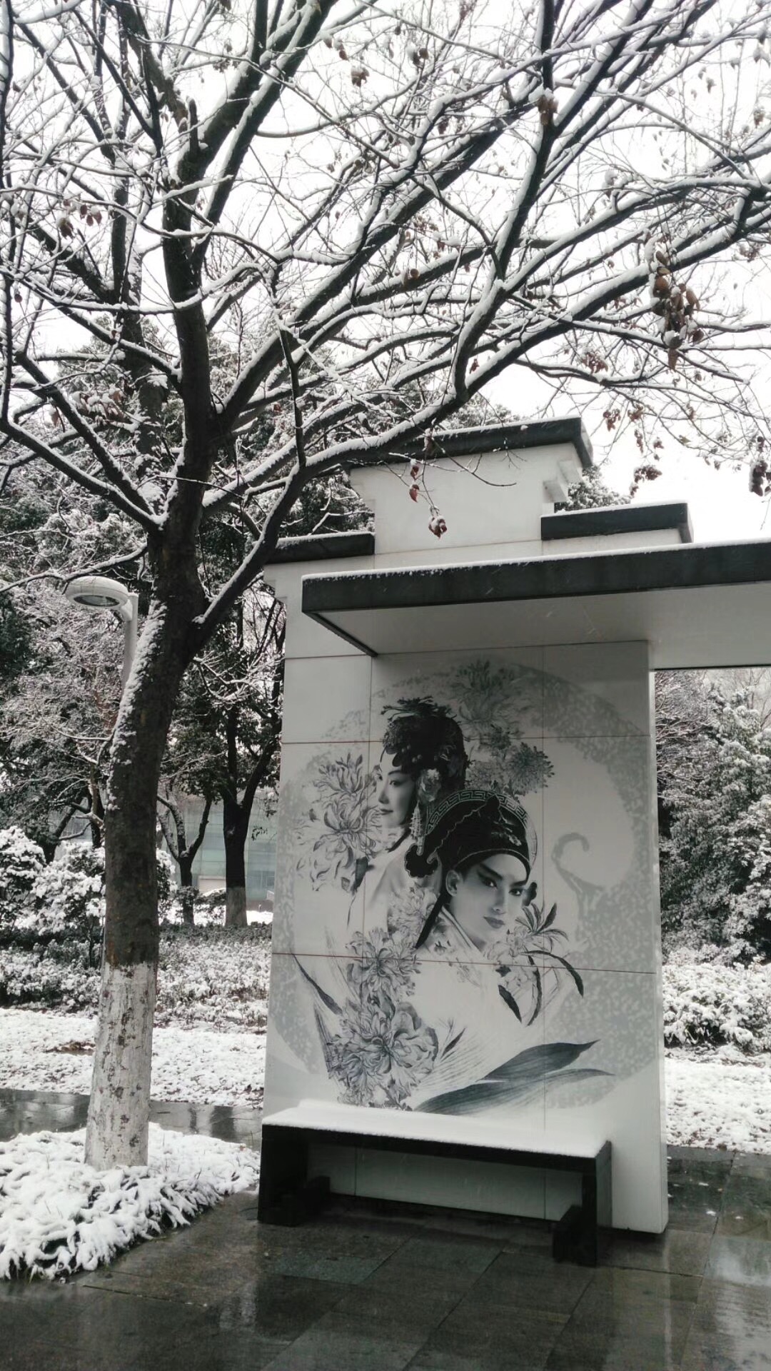 昆曲,白雪,清秀的杜麗娘和柳夢梅的肖像,空無一人的昆城西的公交站,這里的韻味十足,寂靜的好像等著一場《牡丹亭》華麗開場。