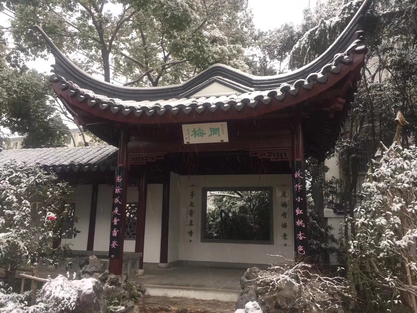 人生幾度悲歡事,靜看亭前雪落時。