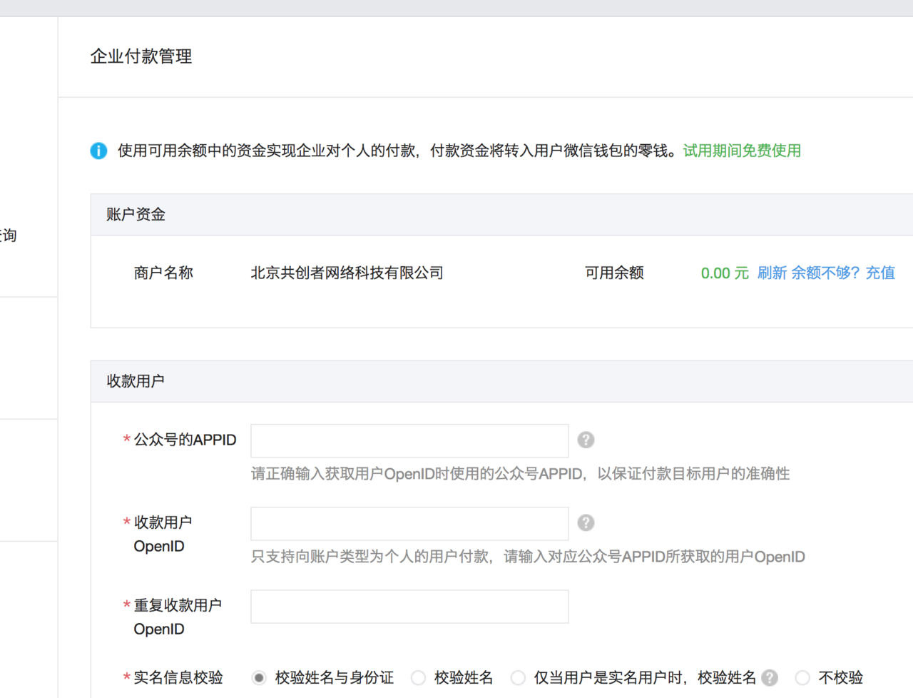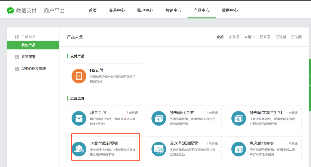 解決:在微信企業平臺-產品中心,開通“企業付款到零錢”;在提現到企業對公賬戶之前,將不屬于公司收入的部分結算出去,類似于企業支付寶可以通過轉賬的方式,在提現到對公企業賬戶之前,用支付寶轉賬將不屬于公司收入的資金轉出到對方賬戶,這部分錢也就不用重復交稅;