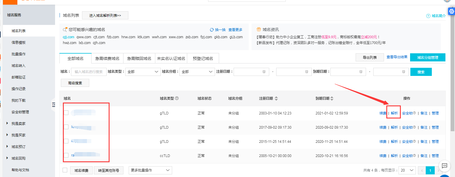 3、選擇需要解析的域名,點解析