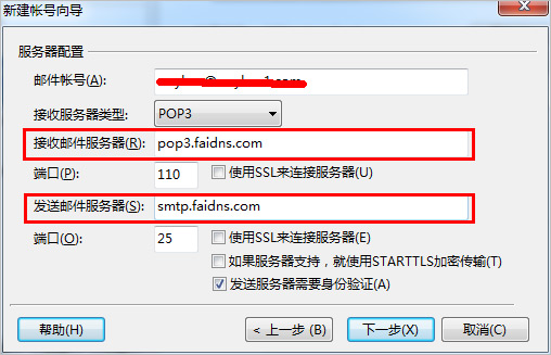 把靠前查詢到的POP3(接收郵件服務器)和STMP(發送郵件服務器)輸入到對應的位置,點擊下一步——保存,設置完成。