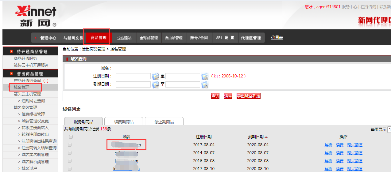 登陸新網,點擊商品管理,域名管理,搜索對應的域名,點擊該域名