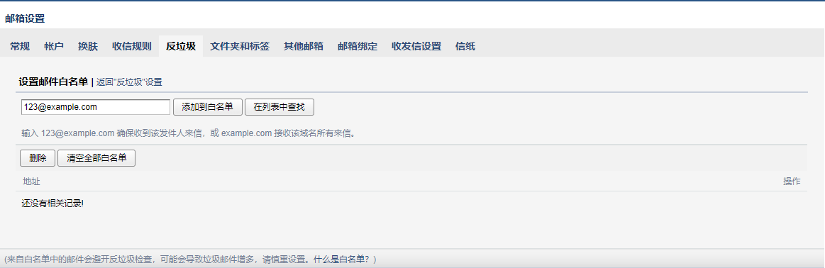 2.輸入完整的地址,如“123@example.com或者example.com”,然后點擊“添加到白名單”按鈕,即可。