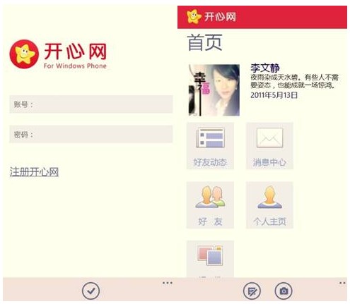 當前登錄WP開心網客戶端的用戶還會發現,登錄頁面采用Metro風格,界面清新簡潔,并且這一版本的開心網客戶端采用了與WP貼合的單一色設計和操作按鈕,充分體現了整潔簡約的交互設計理念。其流暢的切換感受,將給用戶帶來全新的操作體驗。