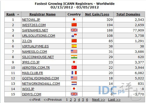 與2012年2月27日公布的數據相比,一周內,西部數碼和SAFENAMES.NET各上升一個名次,分別位居第二、第三,URLSOLUTIONS.COM以凈增長108躍居第四,NETOWL.JP和愛名網依然保持上周的記錄,分別穩居第一,第五,而上周排名第二的中國萬網,未在前5名之列。