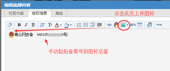 2)選擇版權(quán)信息,將步驟2.3中復(fù)制的備案號(hào)和圖標(biāo)上傳到編輯器里。
