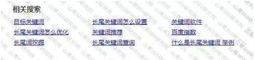 通過百度搜索框,搜索任意關(guān)鍵詞在搜索結(jié)果頁的下面有一個(gè)【相關(guān)搜索】區(qū)域。如圖: