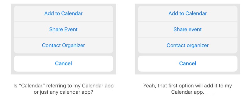 很多公司命名的時候會使用一個描述性的名字(比如“Inbox”、“Calendar”),而不是特殊的詞(比如“Spark”、“Fantastical”)。如果在所有按鈕中使用title case,很難分辨某個詞是否是專有名詞,以影響可用性。