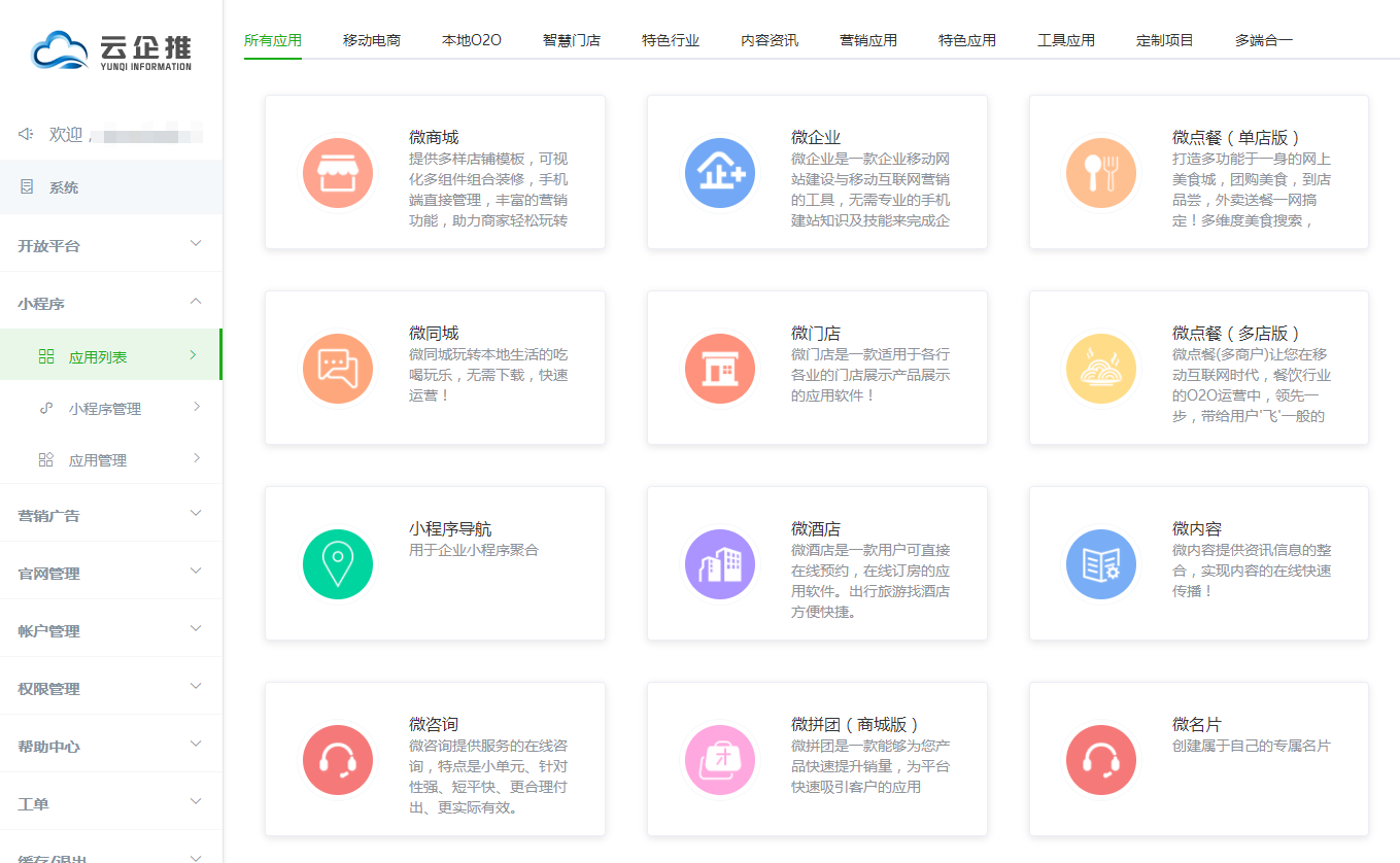 目前覆蓋的行業有電子商務,企業,餐飲,房產,酒店,裝修,預約,教育,物流,咨詢,商城等100多個行業。