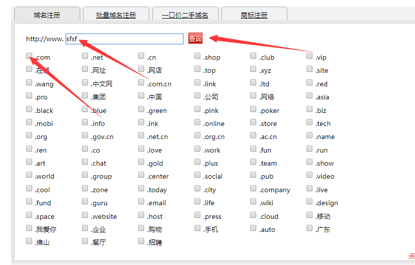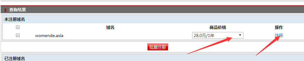 ② 進入管理中心,輸入想購買的域名,勾選域名的后綴(.com.cn.net),點擊查詢按鈕,如果該域名可注冊,則繼續選擇域名注冊的年限,點擊注冊