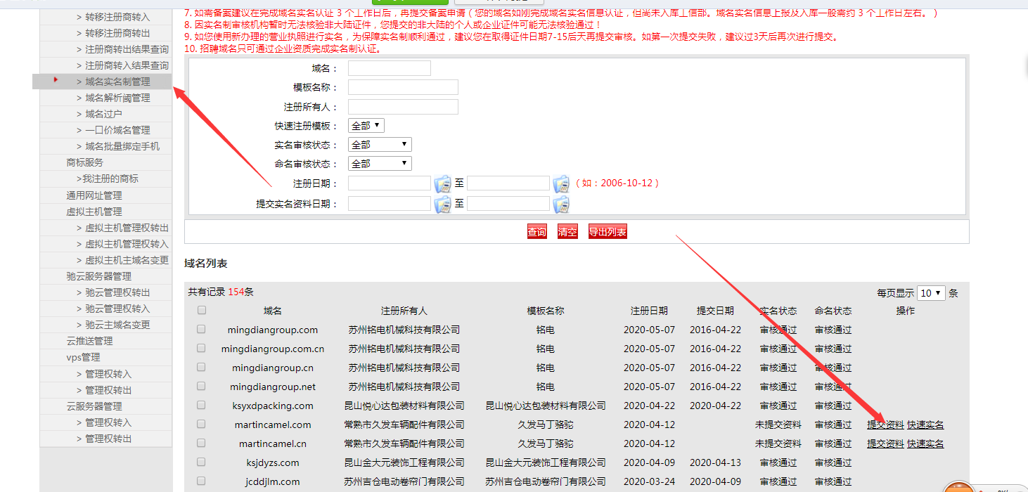 ④ 返回商品管理,域名實名制管理,提交實名資料