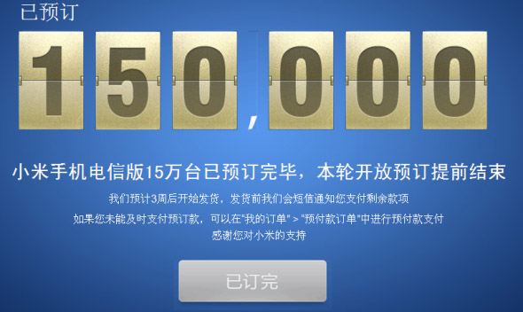 據(jù)小米手機官網(wǎng)消息,首輪預訂不到半小時,15萬臺電信版小米已經(jīng)預訂一空。