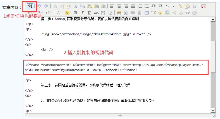 第二步:在網(wǎng)站后臺(tái)編輯器里,切換到代碼模式,插入代碼