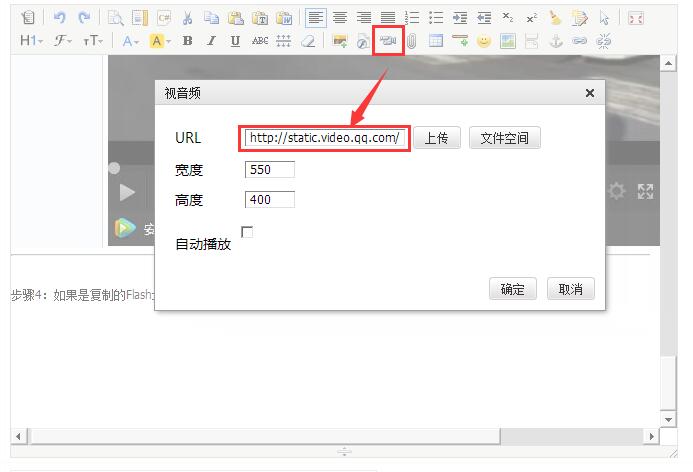 步驟4:如果是復(fù)制的Flash地址,請注意編輯器下,點(diǎn)視頻按鈕,彈出對話框后,粘貼確定后,保存即可。如下圖?
