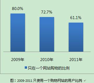 CNNIC數(shù)據(jù)顯示,隨著購物網(wǎng)站的發(fā)展,網(wǎng)民選擇購物的網(wǎng)站數(shù)量在上升。2009年,有80%的網(wǎng)民只在一個(gè)購物網(wǎng)站上網(wǎng)購。2010年有 72.7%的人只在一個(gè)購物網(wǎng)站上網(wǎng)購過,2011年該比例減少為61.1%。也就是說,隨著網(wǎng)購用戶整體購物經(jīng)驗(yàn)的提升,購物網(wǎng)站選擇的單一率在持續(xù)下降。