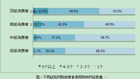 深入分析數(shù)據(jù)發(fā)現(xiàn),網(wǎng)購消費(fèi)卷入越深,使用購物網(wǎng)站的數(shù)量越多。有35%的頂級(jí)消費(fèi)者和49.9%的高級(jí)消費(fèi)者只在一個(gè)購物網(wǎng)站購物,在低級(jí)消費(fèi)者中,這一比例高達(dá)68.1%;同樣,有12.5%的頂級(jí)消費(fèi)者和7.2%的高級(jí)消費(fèi)者在4-5個(gè)網(wǎng)站購物,還有2.6% 的頂級(jí)消費(fèi)者使用的購物網(wǎng)站在5個(gè)以上,而只有1.7%的低級(jí)消費(fèi)者在4-5個(gè)購物網(wǎng)站購物。換言之,用戶使用越深入,選擇越多元。