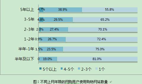 從互聯(lián)網(wǎng)使用經(jīng)驗(yàn)的角度看,網(wǎng)齡越長,選擇網(wǎng)站也越多樣性。網(wǎng)齡半年以下的網(wǎng)購用戶中,有81%的人只在一個(gè)購物網(wǎng)站購物,而網(wǎng)齡5年以上的網(wǎng)購用戶,這一比例下降到55.8%。同樣,網(wǎng)齡3-5年和5年以上的網(wǎng)購用戶,分別有4.8%和4.7%的人在4-5個(gè)購物網(wǎng)站購物,而網(wǎng)齡1-2年和1年以下的比例下降為0.9%和1.5%。